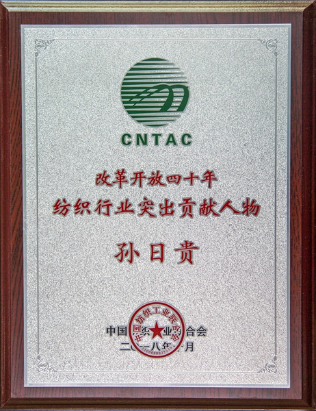 2018年10月16日,中國(guó)紡織工業(yè)聯(lián)合會(huì)第四屆第四次常務(wù)理事擴(kuò)大會(huì)議在上海召開,公布140位“改革開放40年紡織行業(yè)突出貢獻(xiàn)人物”。 中國(guó)紡織工業(yè)聯(lián)合會(huì)特邀副會(huì)長(zhǎng)、孚日控股集團(tuán)董事長(zhǎng)孫日貴榜上有名、登臺(tái)領(lǐng)獎(jiǎng)。