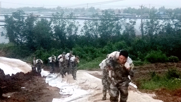 險情就是集結號,救災就是沖鋒號。滿是泥濘的救災現(xiàn)場,臨時磚路的旁邊就是深淺不一的河溝。在往返兩千多米的泥路上,孚日民兵留下了奮戰(zhàn)的身影,在機械設備難以進場的情況下詮釋了強大的戰(zhàn)斗力。帶隊上陣的李洪甲已年近半百,仍毅然和隊員們還一起肩扛沙袋向著岸堤沖鋒。