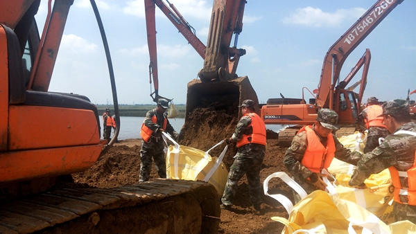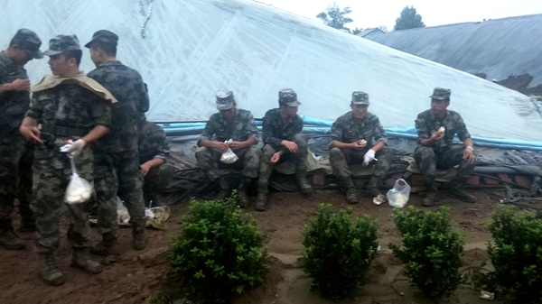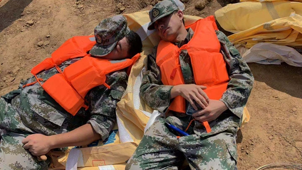 8月15日,孚日集團民兵分隊搭乘沖鋒舟,前往張僧河東岸裝填沙袋,參與完成最后的決堤合攏任務。挖掘機等大型機械投入救災,民兵們的號子聲、腳步聲和機械作業(yè)聲交織,大家意志堅定為同一個目標拼搏,終于將肆虐的洪水攔在了河道之內。至此,民兵們已經好幾天沒見過床了——累了,他們就地休息,餓了,他們匆忙進食。
