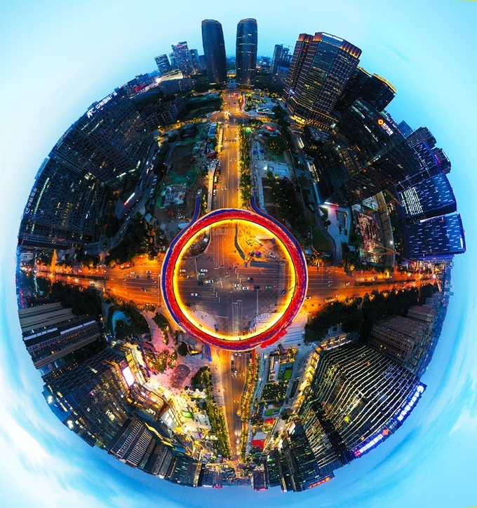 “交子之環(huán)”景觀橋坐落于成都城南,與高達(dá)218米的天府國(guó)際金融中心雙子塔和大批超高層建筑群構(gòu)成“一環(huán)雙塔”的新格局。高空俯瞰,交子之環(huán)的獨(dú)特造型尤為耀眼——大橋內(nèi)直徑達(dá)90米,外直徑達(dá)110米,橋體外觀采用鋼結(jié)構(gòu)造型,最大程度地還原了北宋交子紙幣上的銅錢紋路和紙幣的輕柔質(zhì)感。