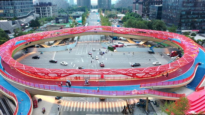 以高顏值爆紅的“交子之環(huán)”景觀橋,由結(jié)構(gòu)環(huán)、交通環(huán)和風(fēng)雨環(huán)廊三部分構(gòu)成。寬達(dá)10米、周長(zhǎng)300米的橋面將陸續(xù)呈現(xiàn)通行、休閑、表演、運(yùn)動(dòng)等場(chǎng)景,使其成為全國(guó)首座擁有多元場(chǎng)景的人行天橋。
