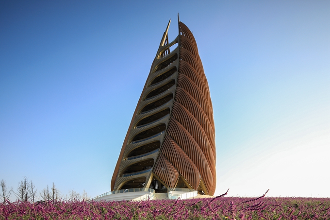同時,為最大程度模擬“春筍”表面的紋理與脈絡(luò),在裝飾裝修階段,項目團隊共采用了近672根單曲不重復(fù)的弧形月牙格柵來編織“春筍”的全曲面幕墻外衣,每一根格柵的大小、形狀都不一樣,最大的一根格柵長度達13.688米,自重超600公斤,所有格柵必須嚴密對應(yīng),每一根格柵和指定位置的偏差必須控制在3毫米內(nèi),為此項目團隊采用BIM技術(shù)來實現(xiàn)精密“織衣”:運用全站儀將各編號關(guān)鍵點進行測放,確定不同軸間每根月牙格柵連接件的坐標(biāo)、軸線等關(guān)鍵定位點,保證安裝就位精度。與此同時,為了更好地還原“春筍”景觀,觀光瞭望塔在噴漆著色等細節(jié)處理上也頗有講究,其外部格柵為淺褐色,在夕陽下泛起淡紅帶金的光澤,配合上包裹著金色GRP材料的鋼結(jié)構(gòu)框架,生動地以建筑呈現(xiàn)出自然之美。
