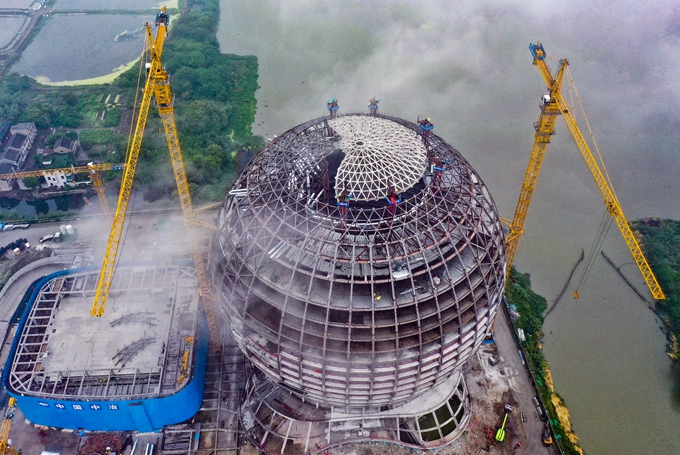 中國(guó)五冶“太陽(yáng)酒店·水晶晶廣場(chǎng)”項(xiàng)目位于浙江省湖州市南部新城,東臨沈莊漾,規(guī)劃用地面積約330畝,總建筑面積約22萬(wàn)平方米,分太陽(yáng)酒店、水晶晶廣場(chǎng)兩個(gè)區(qū)塊。其中太陽(yáng)酒店是一座五星級(jí)綜合性酒店,形態(tài)為一座19層球體酒店建筑,高98.7米,直徑97.2米,項(xiàng)目建成后將成為世界最大的球體建筑,其弧形屋蓋為單層球面網(wǎng)殼結(jié)構(gòu),最大跨度58.8米,受限于電梯井布局和超高的內(nèi)部懸空空間,既無(wú)法分塊吊裝,也無(wú)法在地面拼裝后整體提升。項(xiàng)目團(tuán)隊(duì)通過(guò)多次技術(shù)攻關(guān)并組織模擬推演,確定了“原位分塊吊裝+局部提升”的方案。本次需要提升的穹頂部分重116噸,組成穹頂?shù)南湫蜆?gòu)件截面板厚僅8毫米,且整體跨度大,并呈不規(guī)則的蝴蝶狀,已經(jīng)達(dá)到了該類型結(jié)構(gòu)設(shè)計(jì)的極限,是目前國(guó)內(nèi)跨度最大的球體網(wǎng)殼結(jié)構(gòu)。