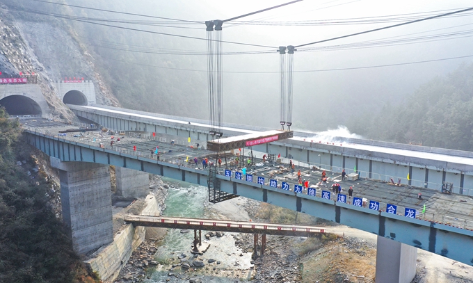 項目鋼結構技術負責人黃治銘介紹,項目所處高山峽谷地帶地勢陡峭,無法提供大型起吊設備進入施工現(xiàn)場的通道,加之大橋下方的平通河河道狹窄,傳統(tǒng)的機械吊裝和船只運輸將對河流生態(tài)帶來破壞。“最終,考慮到大橋特殊的地理環(huán)境,施工團隊研發(fā)了國內(nèi)首創(chuàng)的纜索吊裝懸拼安裝工藝,將大橋分成共計94節(jié)不同節(jié)段,采用單組60噸、雙組85噸的纜索吊解決垂直與水平運輸難題,并借助混凝土梁掛籃施工的思路,運用懸挑法對稱拼裝,實現(xiàn)20萬套螺栓的100%穿孔,成功完成大橋共計5525噸鋼結構的安裝任務。”
