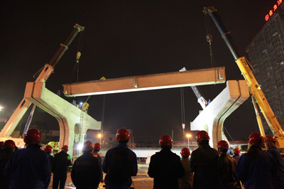 11月22日晚23點(diǎn)28分,在四臺(tái)大型吊車(chē)的同時(shí)作業(yè)下,??作為“兩環(huán)兩射兩快”工程中的“兩射”之一,成溫射線首跨箱梁至11月23日凌晨完成首跨8片箱梁的吊裝施工,標(biāo)志著成溫射線改造工程進(jìn)入上部結(jié)構(gòu)施工階段。四川省、成都市主流媒體《華西都市報(bào)》、《成都日?qǐng)?bào)》、《成都商報(bào)》、《成都晚報(bào)》、《天府早報(bào)》、成都電視臺(tái)等聚焦報(bào)道了本次吊裝。