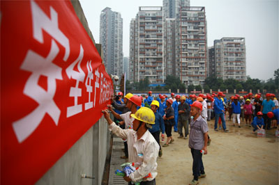 啟動儀式上,集團公司首先對安全生產月活動進行了動員,對安全生產月活動提出了相關要求。隨后,華興美廬項目部負責人帶領現(xiàn)場所有員工作出安全承諾;同時,集團公司團委向項目部授予了“青安崗”崗牌,并向項目部及職工贈送了安全掛圖和安全知識手冊。在安全知識有獎問答環(huán)節(jié),現(xiàn)場的項目部員工和分包隊伍爭相回答主持人的提問,在贏得獎品的同時,再一次加深了對安全生產的認識。儀式最后,現(xiàn)場所有人員還進行了安全承諾簽名。