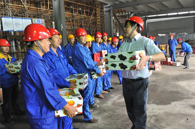 9月30日上午,正值祖國65歲華誕即將來臨之際,受中國五冶集團(tuán)暨上海有限公司董事長、黨委書記程并強(qiáng)委托,上海有限公司領(lǐng)導(dǎo)徐永鋒、薛志群、汪忠旭、倪治壽及有限公司機(jī)關(guān)部門負(fù)責(zé)人一行來到寶鋼一期焦?fàn)t原地大修改造工程項(xiàng)目部,慰問奮戰(zhàn)在施工一線的廣大員工們,向他們送去節(jié)日慰問品,并祝愿他們節(jié)日愉快。