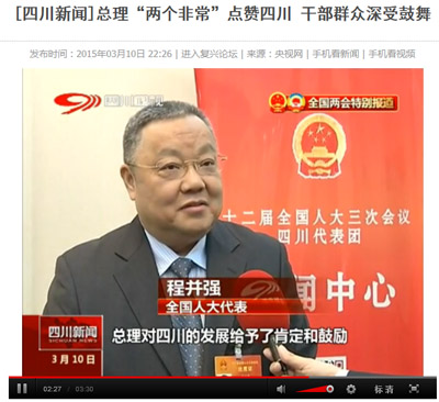 為此,四川衛(wèi)視在3月10日《四川新聞》“全國兩會特別報道”中,以“總理‘兩個非常’點贊四川?干部群眾深受鼓舞”為主題,對參加十二屆全國人大三次會議四川代表團部分全國人大代表進行了采訪,全國人大代表,中國五冶集團董事長、黨委書記程并強在采訪中表示:總理對四川的發(fā)展給予了肯定和鼓勵,同時也指明了一些方向,特別是通過加大基礎設施建設、水利建設、交通建設,促進四川發(fā)展,要求四川轉型升級方面感觸很深?!?br/> http://news.cntv.cn/2015/03/10/VIDE1425997439608963.shtml央視網