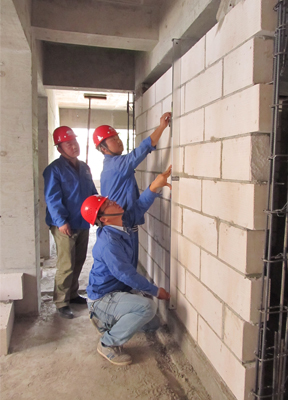 機械化公司昆鐵家園的管理人員正在進行內墻砌筑質量檢測