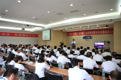 “認(rèn)真踐行‘打造競爭優(yōu)勢’的發(fā)展文化、‘嚴(yán)細(xì)新實’的管理文化、‘敢擔(dān)當(dāng)看療效’的責(zé)任文化,充滿勇氣、充滿信心、充滿激情,奮力開拓市場、全面提升產(chǎn)品、促進(jìn)經(jīng)營創(chuàng)效,為實現(xiàn)‘轉(zhuǎn)型、提升、擴(kuò)張’戰(zhàn)略目標(biāo)而努力奮斗!”5月4日上午,中國五冶大廈三樓多功能廳和上海科技樓六樓大廳里掌聲雷動,一場以“講責(zé)任?比擔(dān)當(dāng)?賽貢獻(xiàn)”的主題演講和“比貢獻(xiàn)?看療效?保目標(biāo)”的勞動競賽動員大會正在進(jìn)行。集團(tuán)公司領(lǐng)導(dǎo)、董事會秘書、總經(jīng)理助理、副三總師,集團(tuán)公司機(jī)關(guān)部門正副職、主管,四川地區(qū)各二級單位班子成員,上海有限公司班子成員,上海有限公司機(jī)關(guān)部門正副職、主管,上海有限公司各單位班子成員共三百余名參加。會議由集團(tuán)公司董事、總經(jīng)理蒙昌嘉主持。