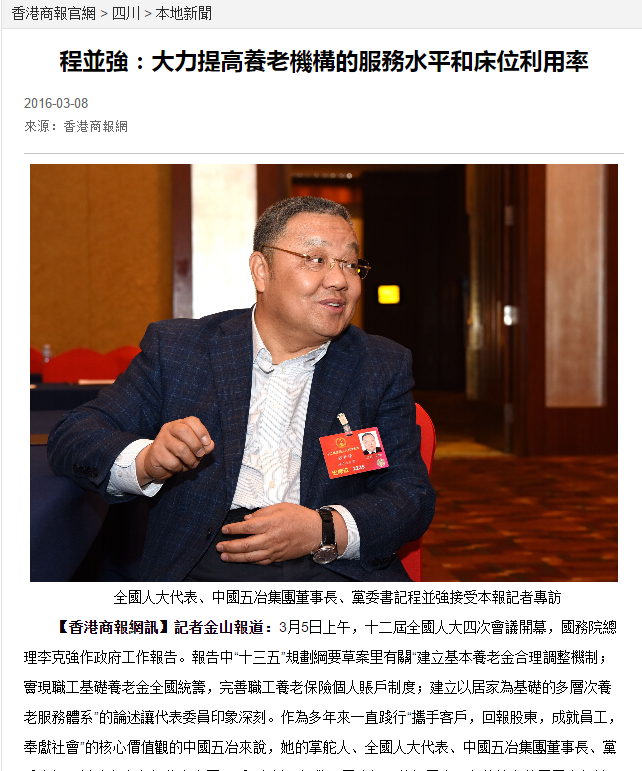 《香港商報網(wǎng)》記者以“大力提高養(yǎng)老機構(gòu)的服務(wù)水平和床位利用率”為題,從李克強總理的工作報告中“十三五”規(guī)劃綱要草案里有關(guān)“建立基本養(yǎng)老金合理調(diào)整機制;實現(xiàn)職工基礎(chǔ)養(yǎng)老金全國統(tǒng)籌等,完善職工養(yǎng)老保險個人賬戶制度;建立以居家為基礎(chǔ)的多層次養(yǎng)老服務(wù)體系等”出發(fā),就如何提高養(yǎng)老機構(gòu)服務(wù)水平,如何提高養(yǎng)老床位利用率等話題,對全國人大代表,中國五冶集團董事長、黨委書記程并強進行了專訪。