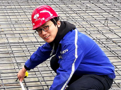 成都鋼構(gòu)公司浙江豪情汽車項目部員工正在測量鋼筋尺寸