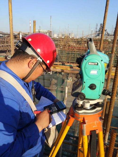 寶鋼工程公司 寶鋼一二燒結(jié)整合大修項目測量員進行現(xiàn)場螺栓定位復測
