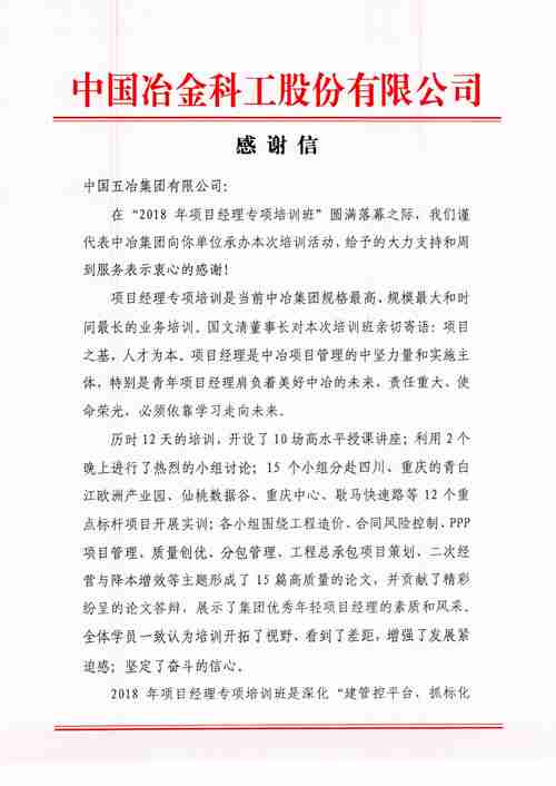 感謝信表示,培訓(xùn)工作的圓滿完成凝聚了中國五冶員工的心血和汗水,中國五冶與集團工程建設(shè)管理部、人力資源部攜手完成此次任務(wù),經(jīng)受住了籌備工作時間緊、任務(wù)重、要求嚴(yán)的考驗。這份榮譽,屬于和我們一起奮斗過的所有參與者!