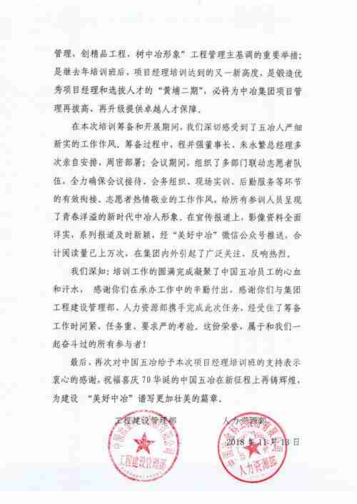 11月13日,中國冶金科工股份有限公司工程建設(shè)管理部、人力資源部向中國五冶發(fā)來感謝信,對公司在承辦中冶集團2018年項目經(jīng)理專項培訓(xùn)活動過程中展現(xiàn)的嚴(yán)細(xì)新實的工作作風(fēng)表示肯定。