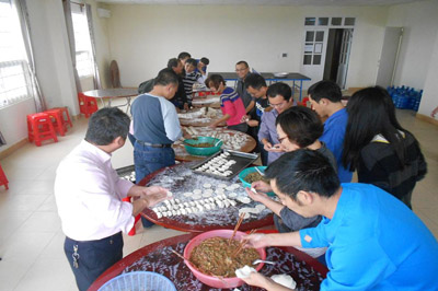 活動(dòng)前,大家做了很多準(zhǔn)備工作。一切就緒,大家紛紛捋起衣袖,揉面、和餡,切段、搟皮,各有分工,其樂融融。大家來自五湖四海,包法各具地方特色,包出來的餃子也各式各樣。女同志心靈手巧,包餃子功夫嫻熟,包出的餃子精美別致,大家拍手叫絕;男同志手藝略顯生疏,卻不甘落后,不滿足于傳統(tǒng)餃子的形狀,試著玩起各種花樣。頃刻間,獨(dú)具特色的花式餃子紛紛呈現(xiàn)在大家面前,于是又彼此“評頭論足”起來。當(dāng)現(xiàn)場工地上的同事下班回到食堂時(shí),一盆盆熱騰騰的餃子已端到了桌上,品嘗著同事們親手包的餃子,大家吃在嘴里,甜在心上,感受到了越南臺塑項(xiàng)目部這個(gè)大家庭的幸福和溫暖。??(李娜娜)